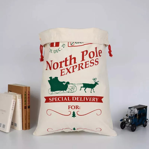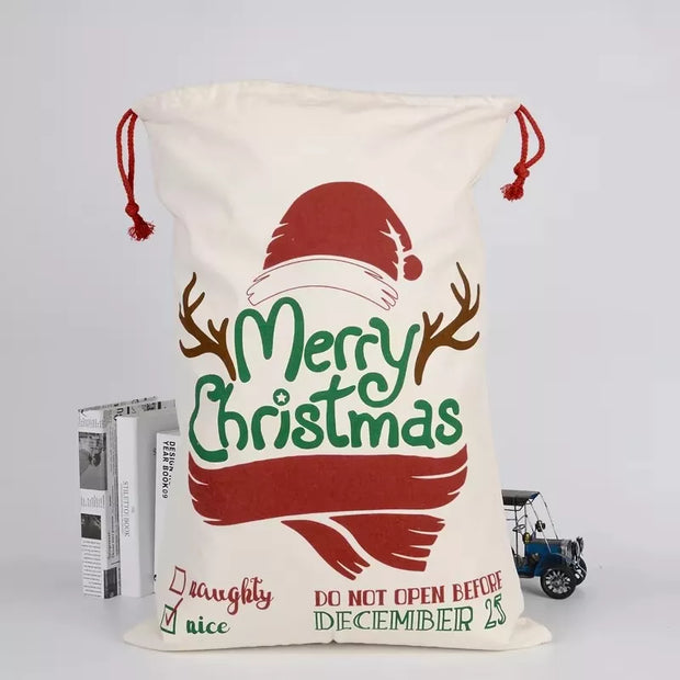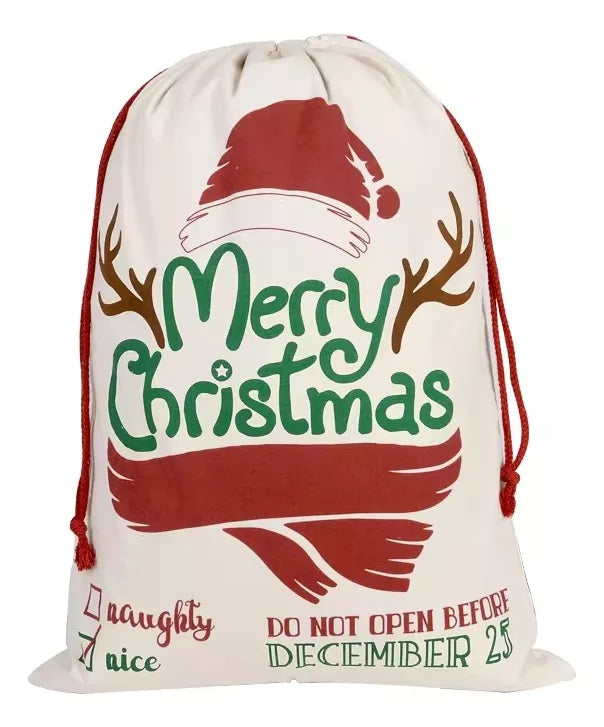 Costal (Saco) Navideño para regalos. Mide 70 cm x 50 cm, cuenta con costuras reforzadas y cordón grueso para ajuste y cerrado. Fabricados en Algodón, color crudo. Materiales seguro para el contacto con la piel o alimentos, 100% lavable en máquina y/o a mano, bolsa gruesa y duradera que soporta hasta 30kg